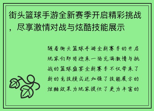 街头篮球手游全新赛季开启精彩挑战,尽享激情对战与炫酷技能展示